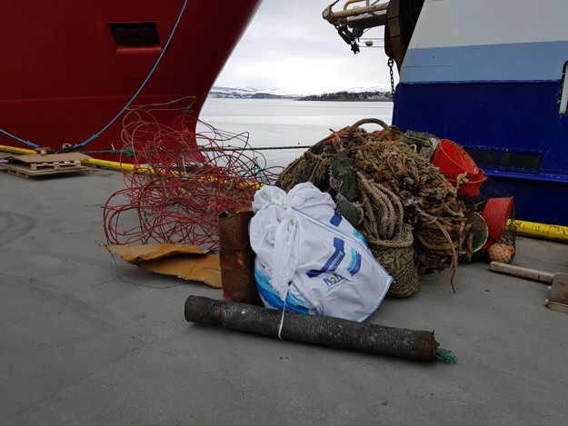 Det finnes elleve Fishing for litter-mottak i Norge. Disse er blant annet lokalisert i Tromsø, Ålesund, Egersund, Karmøy, Hvaler, Måløy, Stamsund, Austevoll og Båtsfjord. Dette bildet er tatt på kaien ved sistnevnte. Foto: Lerøy