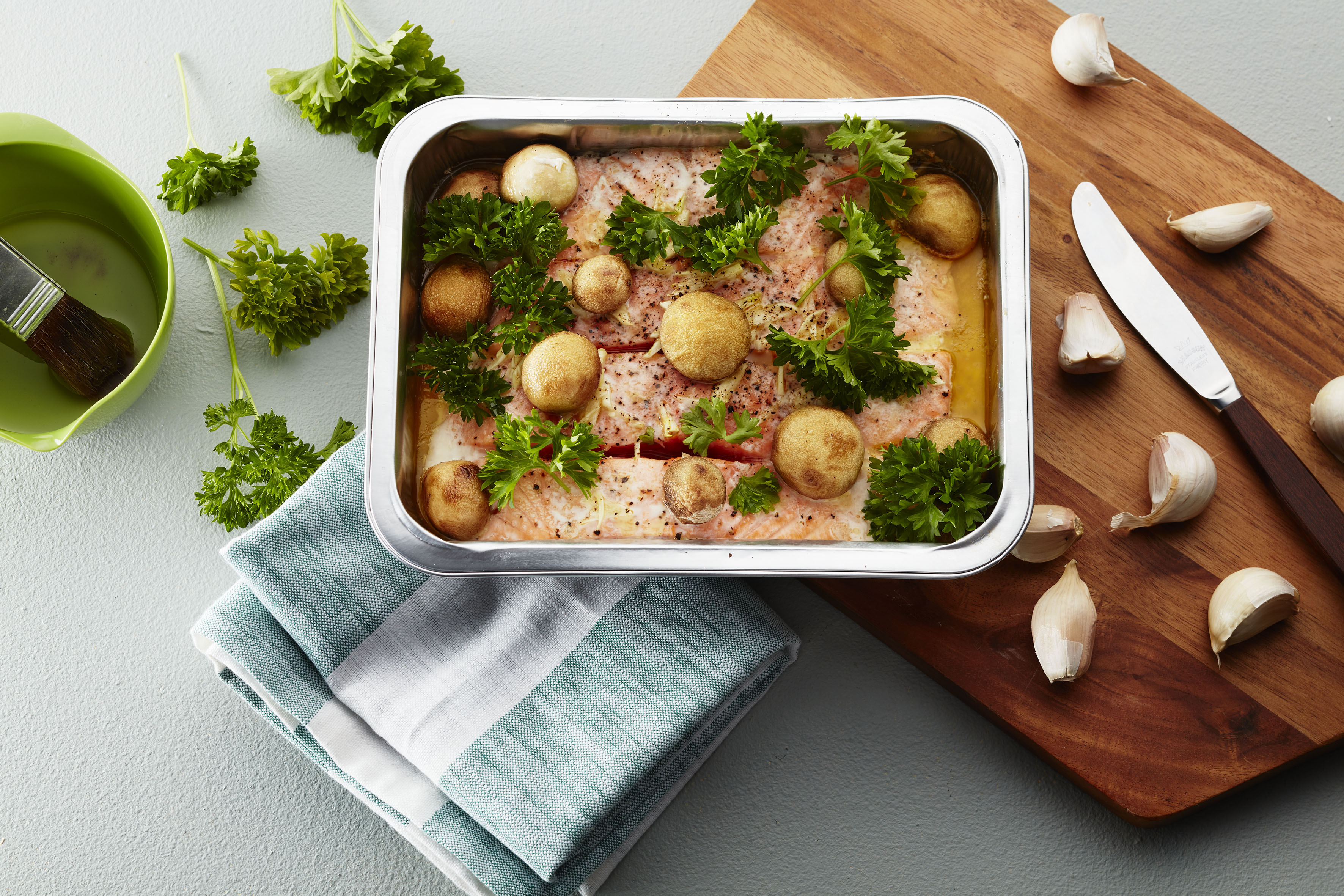 3. Kutt squash og laks i skiver. Legg dem sammen med potetene i en ildfast form.